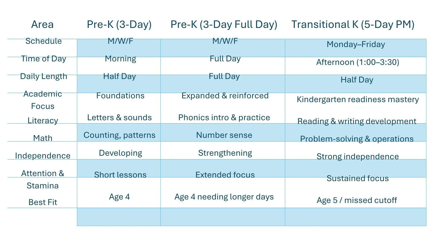 The afternoon schedule allows children to arrive rested and ready for focused learning while offering families flexibility. Many children benefit from a shorter, intentional instructional block at this age.
